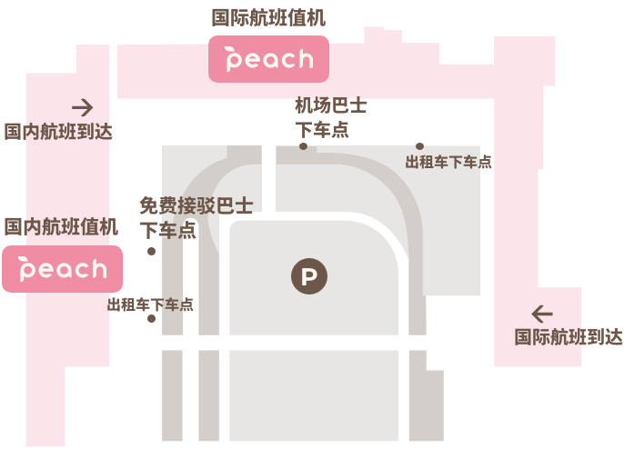到达Aeroplaza后,请在1楼搭乘接驳巴士前往第2航站楼。