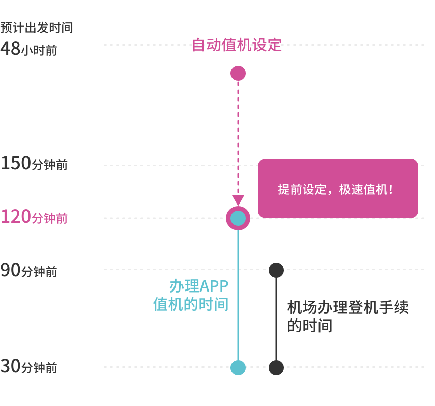 这是APP专属功能,可在预计出发时间前 48 小时进行设定,届时APP会自动提前 120 分钟完成值机手续。