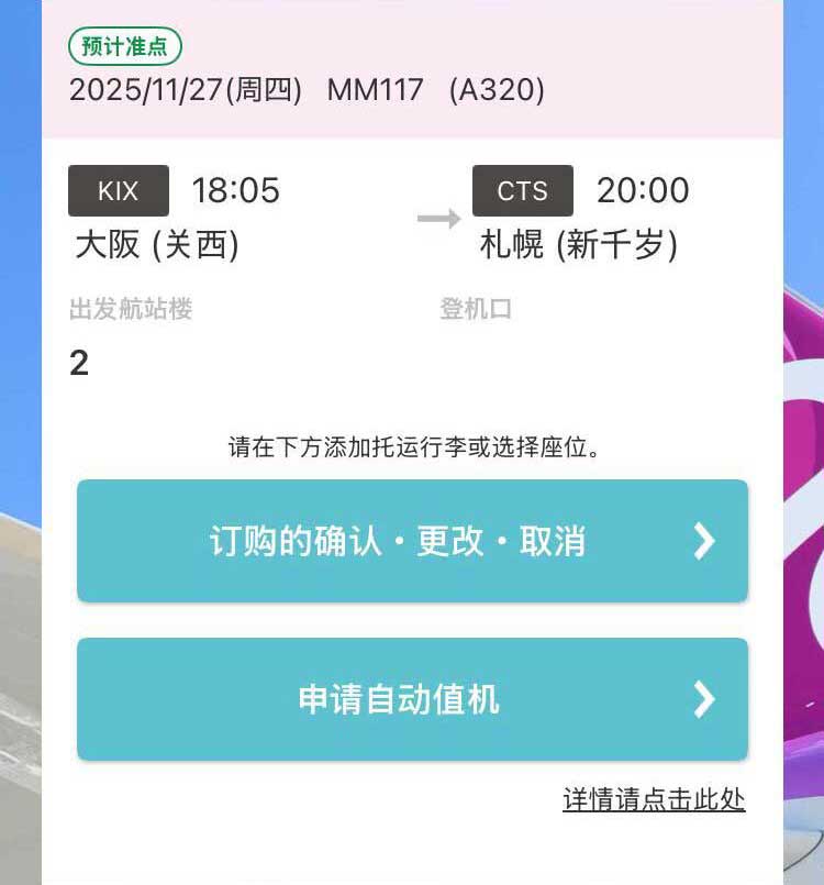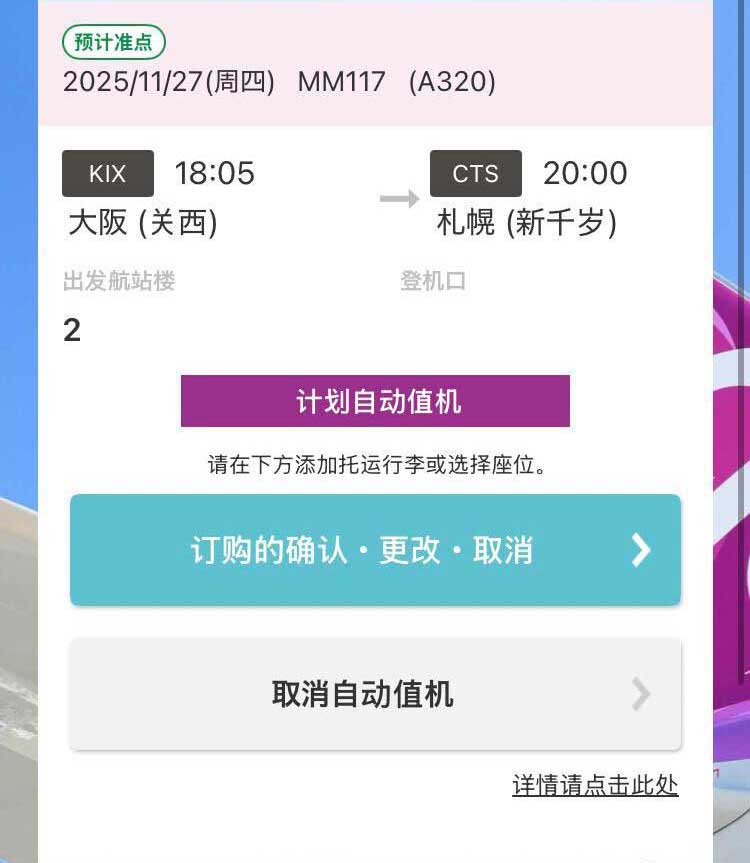 - ・已设定自动值机的航班发生大幅延误或取消等情况下,自动值机将被中止。