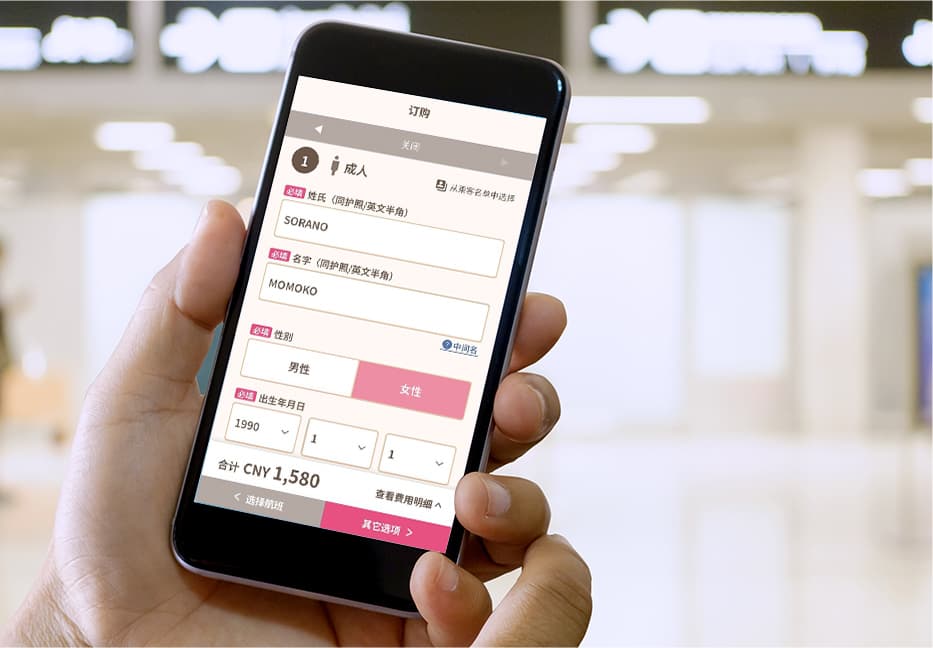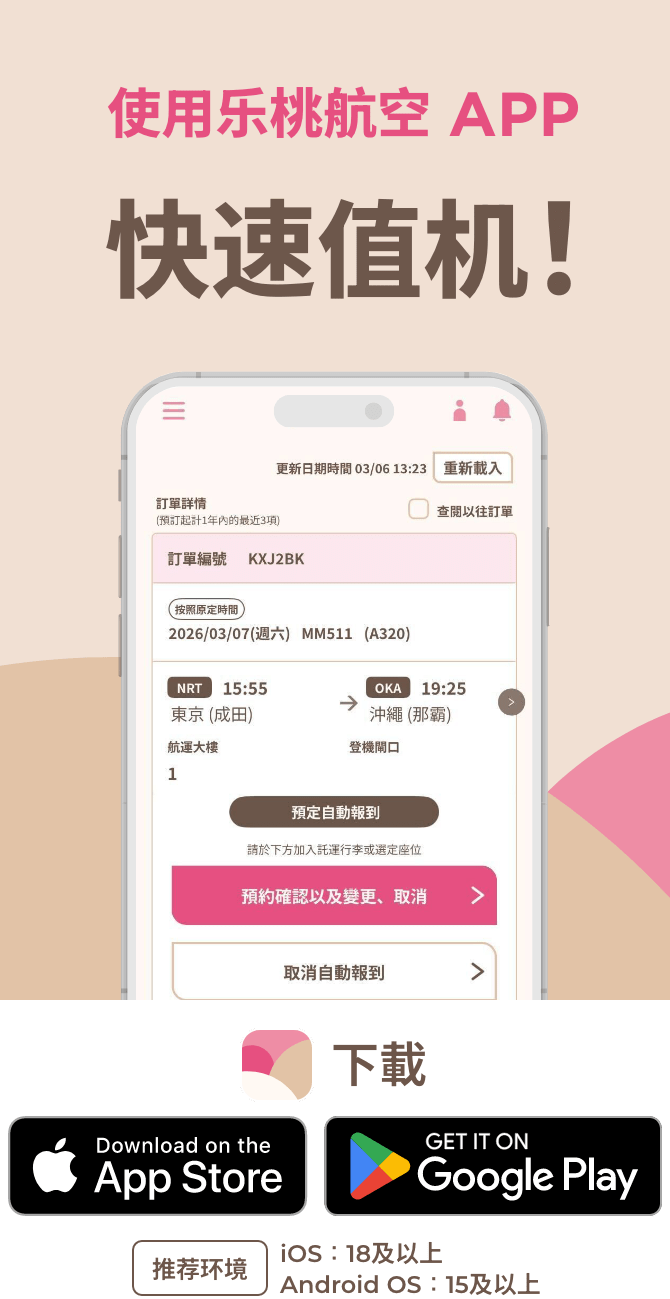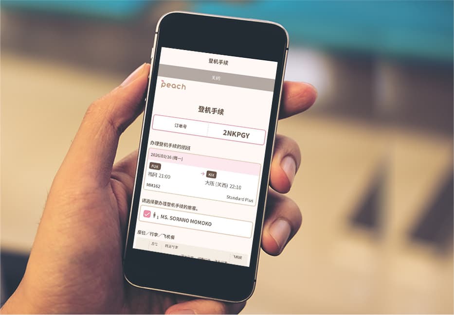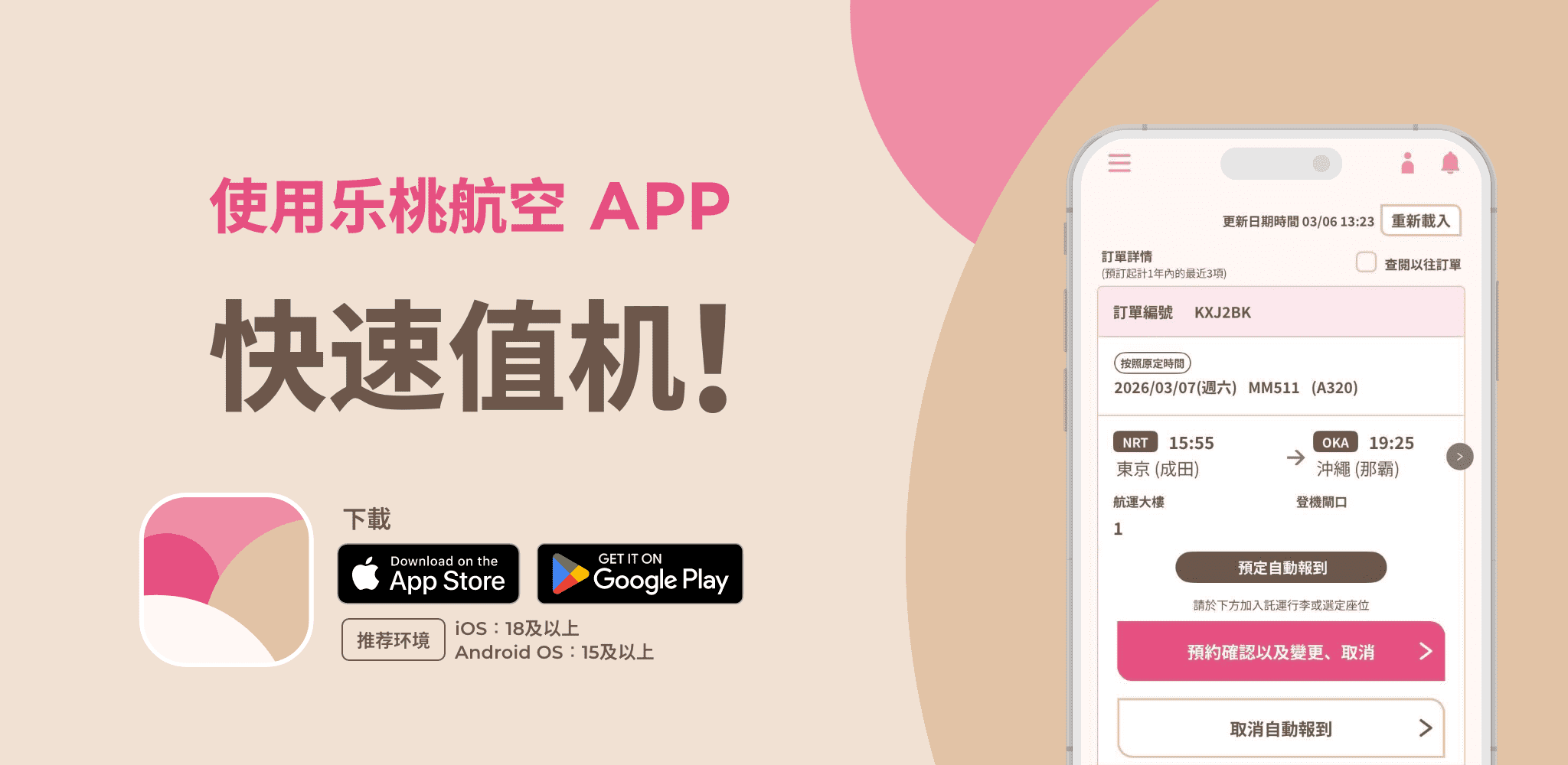 最为轻松快捷的订购和登机方式!首次使用APP时需登录您的Peach账户登入,之后将会保持自动登录。 这样可以省去订购时需要输入各类信息的麻烦,您的订购信息将自动同步到APP上,之后的各项手续也可顺畅进行。