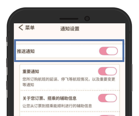 如果您在智能手机的设置中打开APP的通知,然后在APP的“菜单”→“通知设置”中打开“推送通知”,您就可以收到航班取消、延误等航班信息更改的通知。