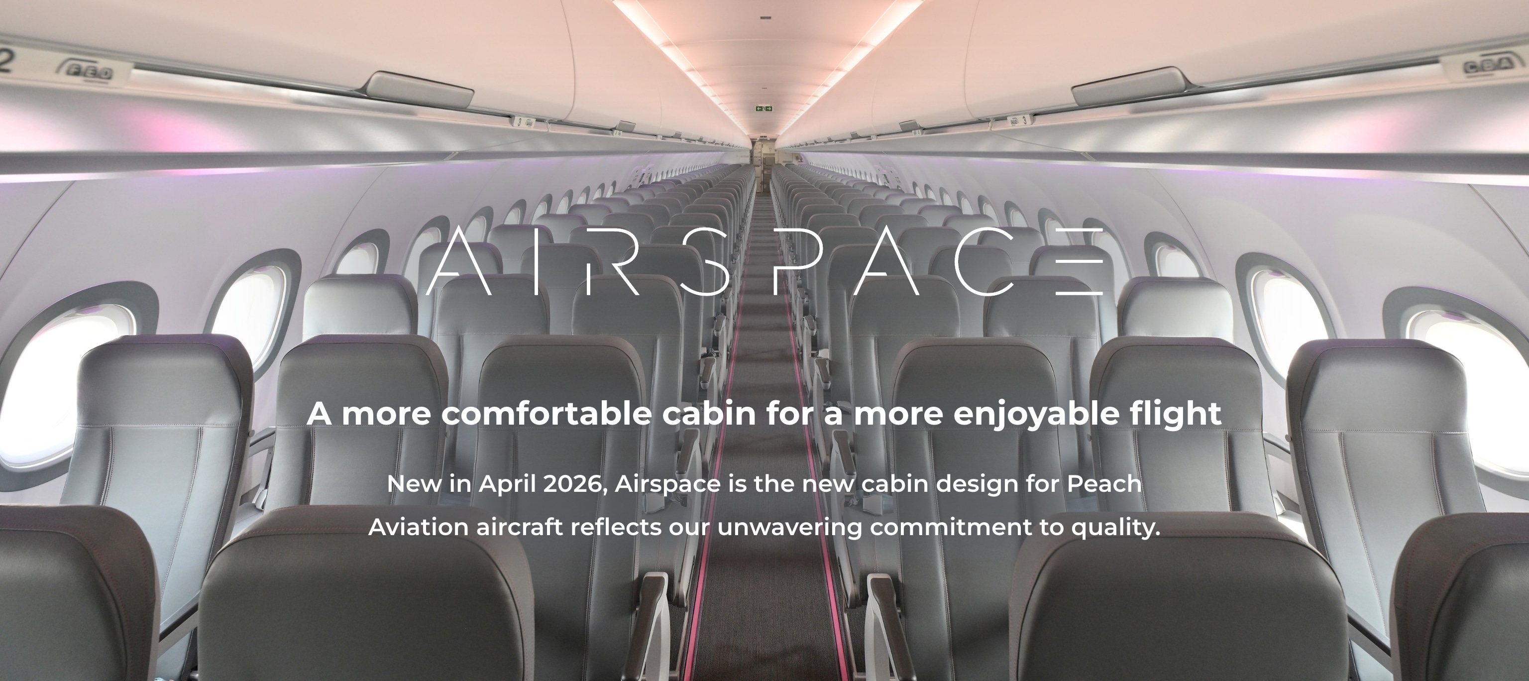 At Peach, we have adopted Airspace Premium, which helps make sky travel more comfortable and pleasant with spacious baggage compartments and LED mood lighting.