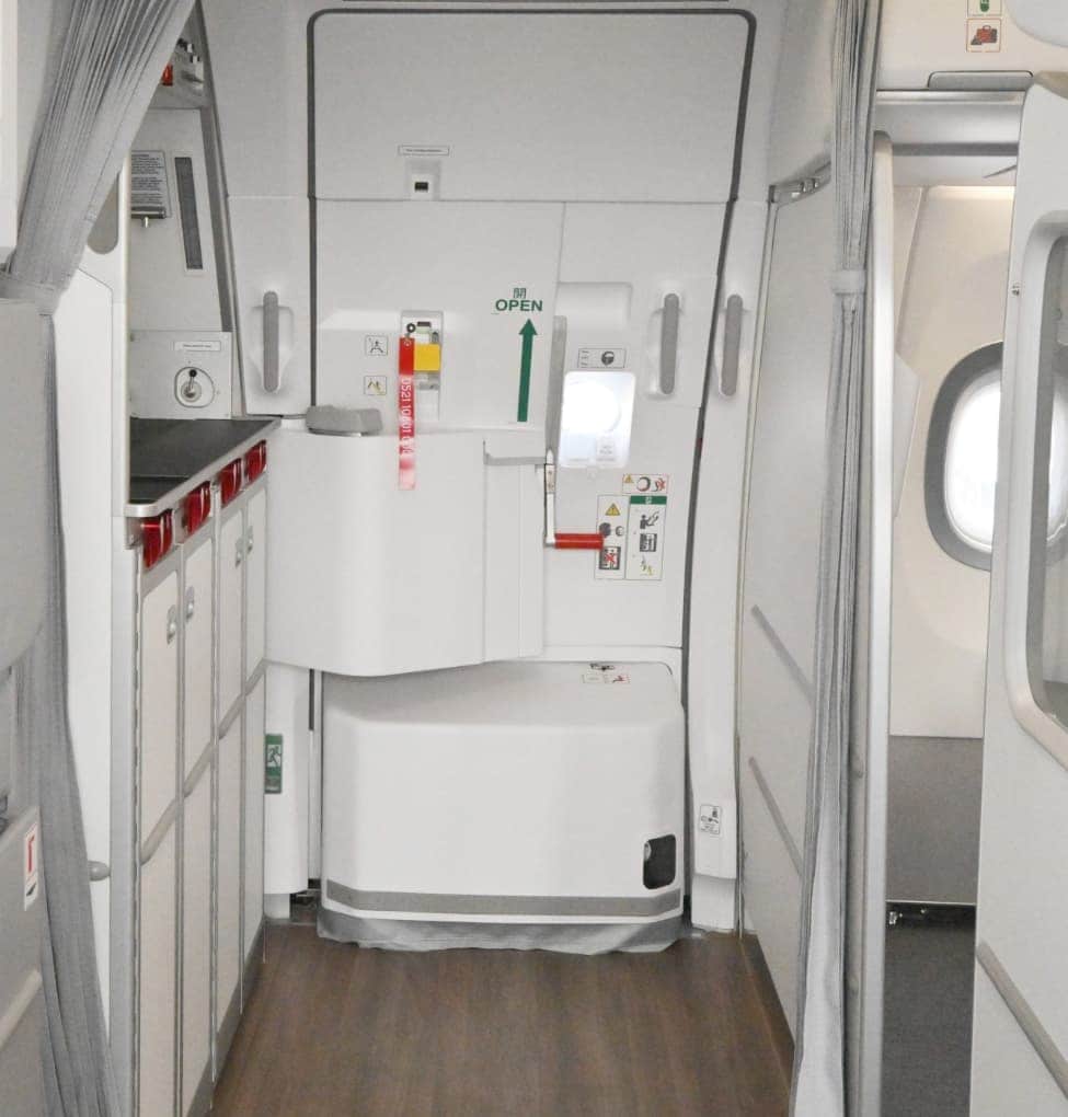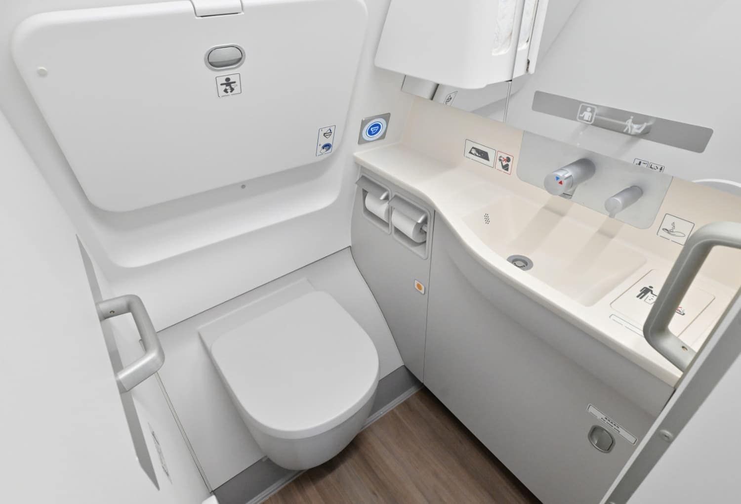 For instance, lavatories in the front have handrails and transfer seats for wheelchair users, as well as emergency call buttons positioned lower down for easier reach.