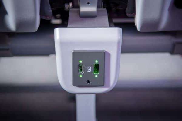 Type A and Type C USB ports are available in all seats—window, center, or aisle.