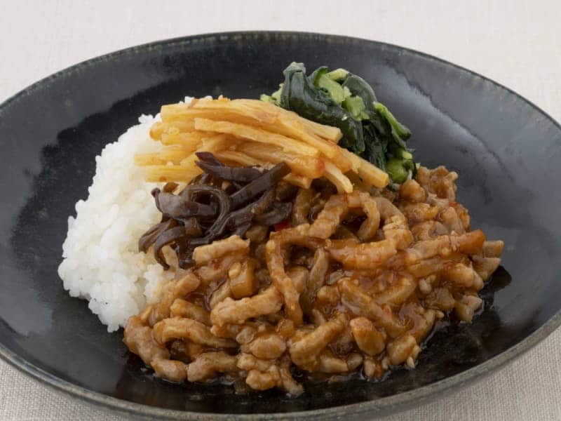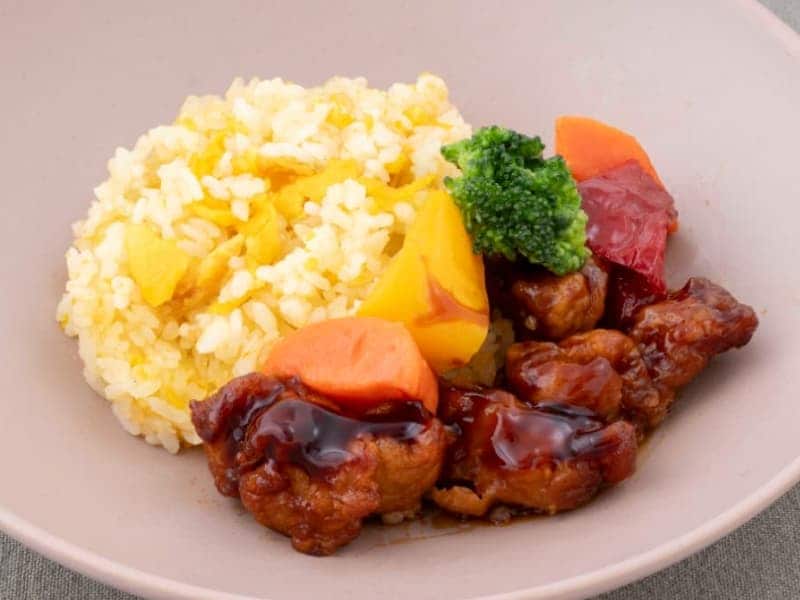 Pork in a rich, tangy black vinegar sauce is paired with fluffy egg fried rice. The balance of acidity, umami, and creamy texture makes this a well-rounded delight.