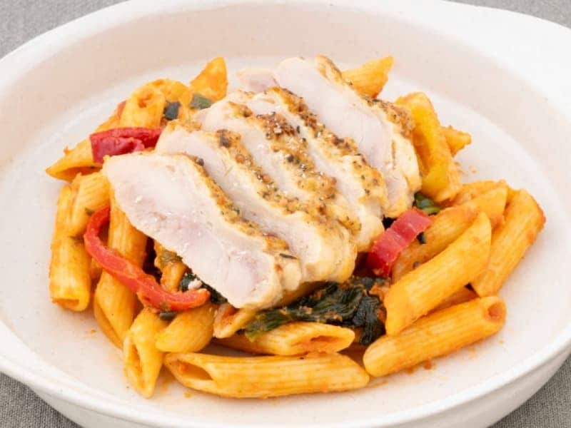 Tender herb chicken pairs perfectly with short pasta in a rich, mellow tomato cream sauce. This hearty, flavorful dish is a colorful celebration of comforting flavors.