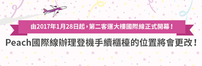 於2017年1月28日(六)起將乘搭Peach 國際線的乘客,敬請務必確認下列資訊,以避免因前往錯誤航廈而導致時間延誤。