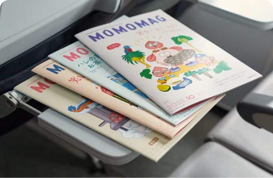 기내지 'MOMOMAG'와 Peach 오리지널 기내식 및 굿즈 판매 등 기내에서 즐길 수 있는 서비스가 준비되어 있습니다.