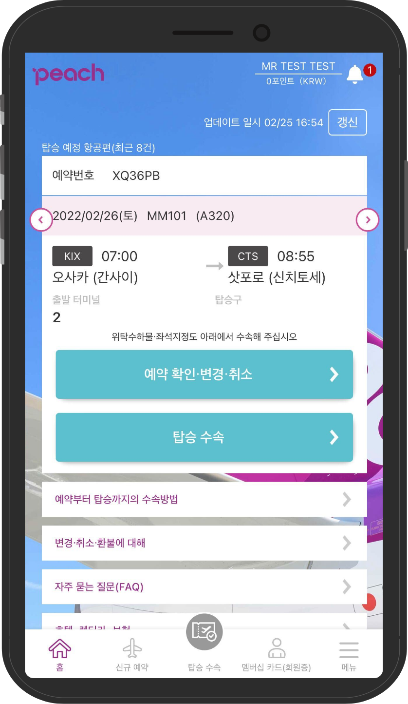 빠르고 간편하게최초 이용 시 Peach 계정에 로그인하고, 이후부터는 자동으로 항상 로그인 상태로 예약 시 번거로운 정보 입력을 생략할 수 있으며, 예약 후 정보가 자동으로 연동되므로 이후에도 원활하게 진행 가능합니다.