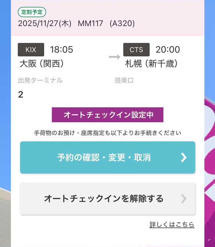 - ・オートチェックインを設定済みの便に大幅遅延/欠航等が発生した場合、オートチェックインは中止され自動でのチェックインは行われません。