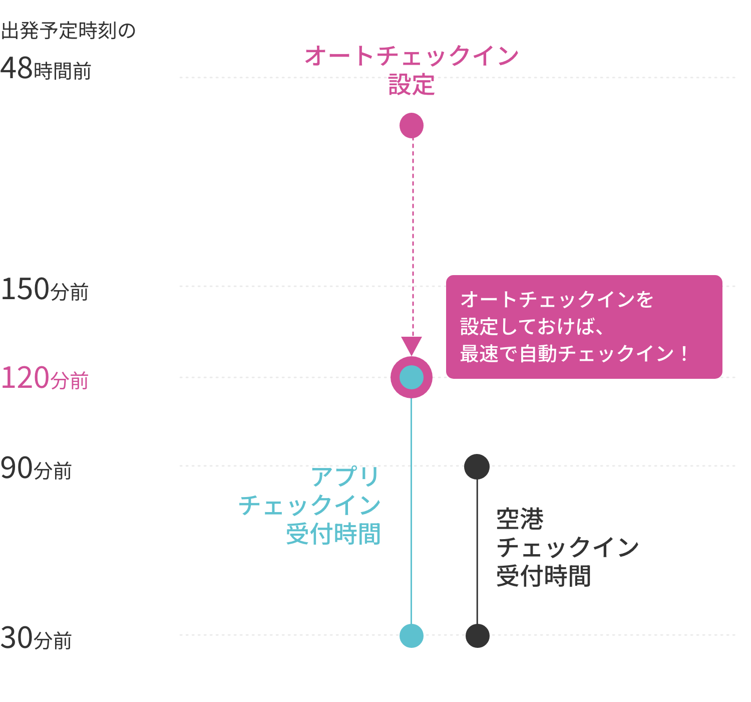出発予定時刻の48時間前からチェックインの事前設定ができるアプリ専用の機能です。