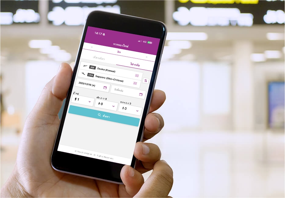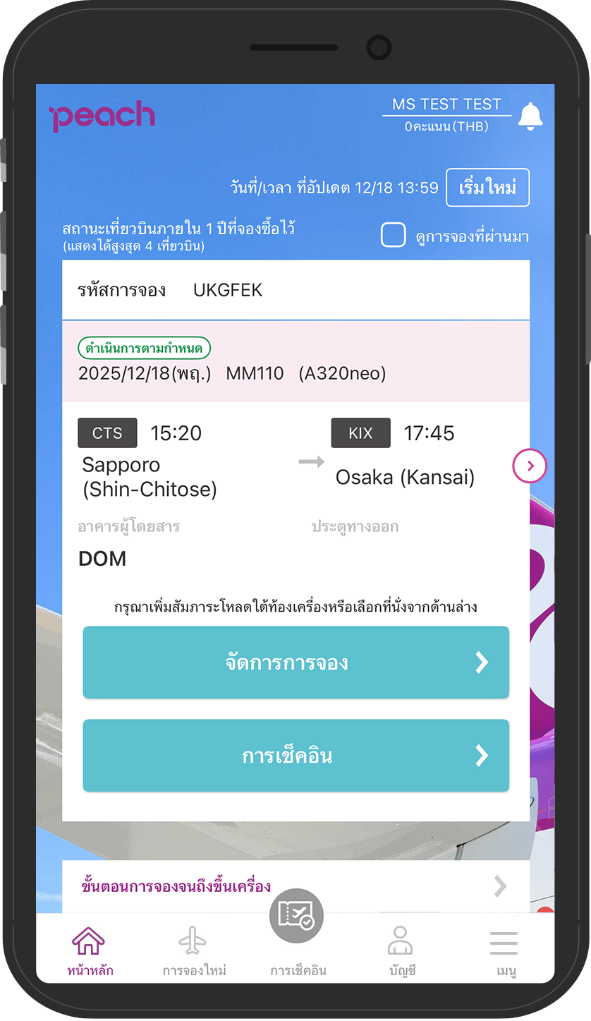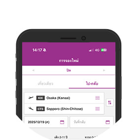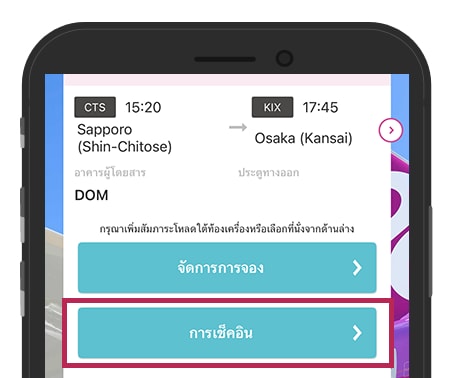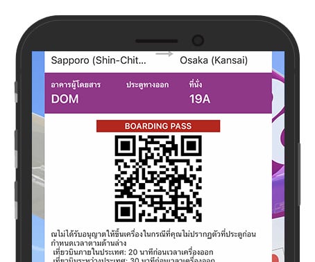 ท่านสามารถเช็คอินได้จากทุกที่ตั้งแต่ 120 นาทีจนถึง 30 นาทีก่อนเวลาออกเดินทางตามกำหนด กรุณาดำเนินการเช็คอินผ่านเมนู ‘เช็คอิน’ ในแอปพลิเคชัน