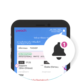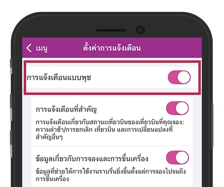 หากท่านเปิดการแจ้งเตือนของแอปพลิเคชันในตั้งค่าของสมาร์ตโฟน และเปิด ‘การแจ้งเตือนแบบพุช’ ในแอปผ่านเมนู ‘การตั้งค่าการแจ้งเตือน’ ท่านจะสามารถรับการแจ้งเตือนเกี่ยวกับการยกเลิกเที่ยวบิน ความล่าช้า และการเปลี่ยนแปลงข้อมูลเที่ยวบินอื่น ๆ ของเที่ยวบินที่ท่านใช้บริการได้